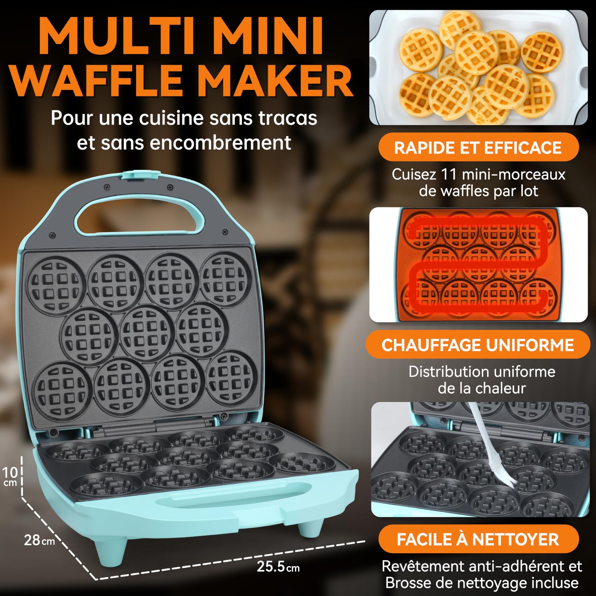 - [Capacité Innovante Multi-Gaufres] : Doté d’un design ingénieux à 11 trous, ce mini gaufrier permet de préparer jusqu’à 11 mini-gaufres de taille parfaite en une seule fois. Idéal pour les matins chargés, accueillir des invités ou préparer des collations en grande quantité, cet appareil à gaufre vous fait gagner du temps et des efforts tout en garantissant que chacun puisse profiter de délicieuses gaufres. Les amateurs de gaufrier professionnel apprécieront également la polyvalence qu’il offre, qu’il s’agisse de recettes sucrées ou salées.