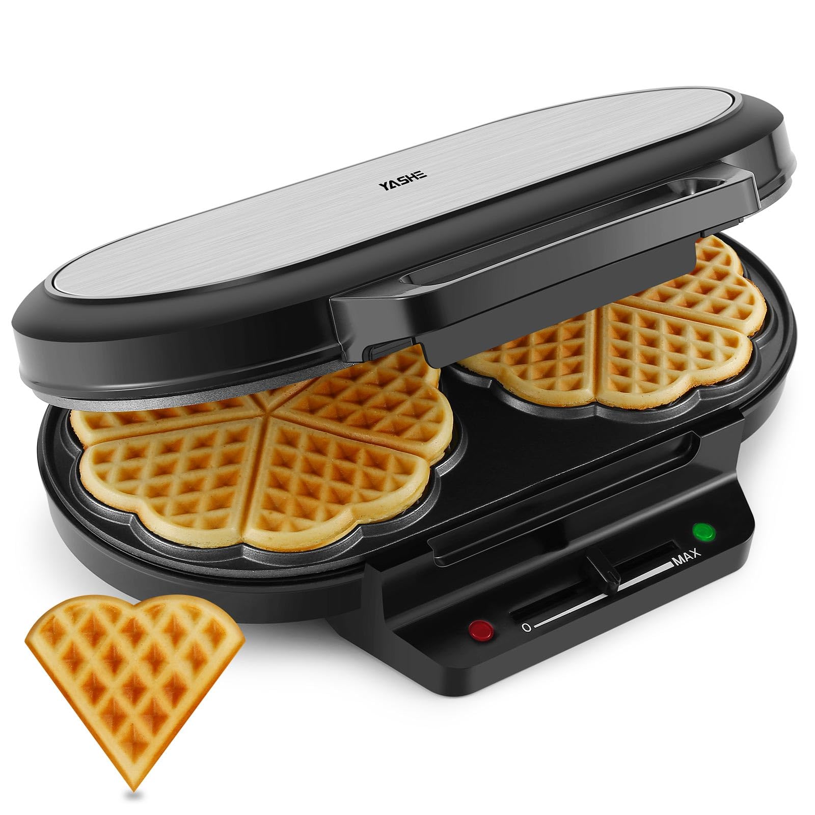 YASHE Machine À Gauffre Coeur, 10 Gaufres Classiques En Forme De Cœur Avec Revêtement Antiadhésif, 5 Réglages De Température Ajustables, Voyants Lumineux, Anti-Débordement, 1200W, Argent/Noir