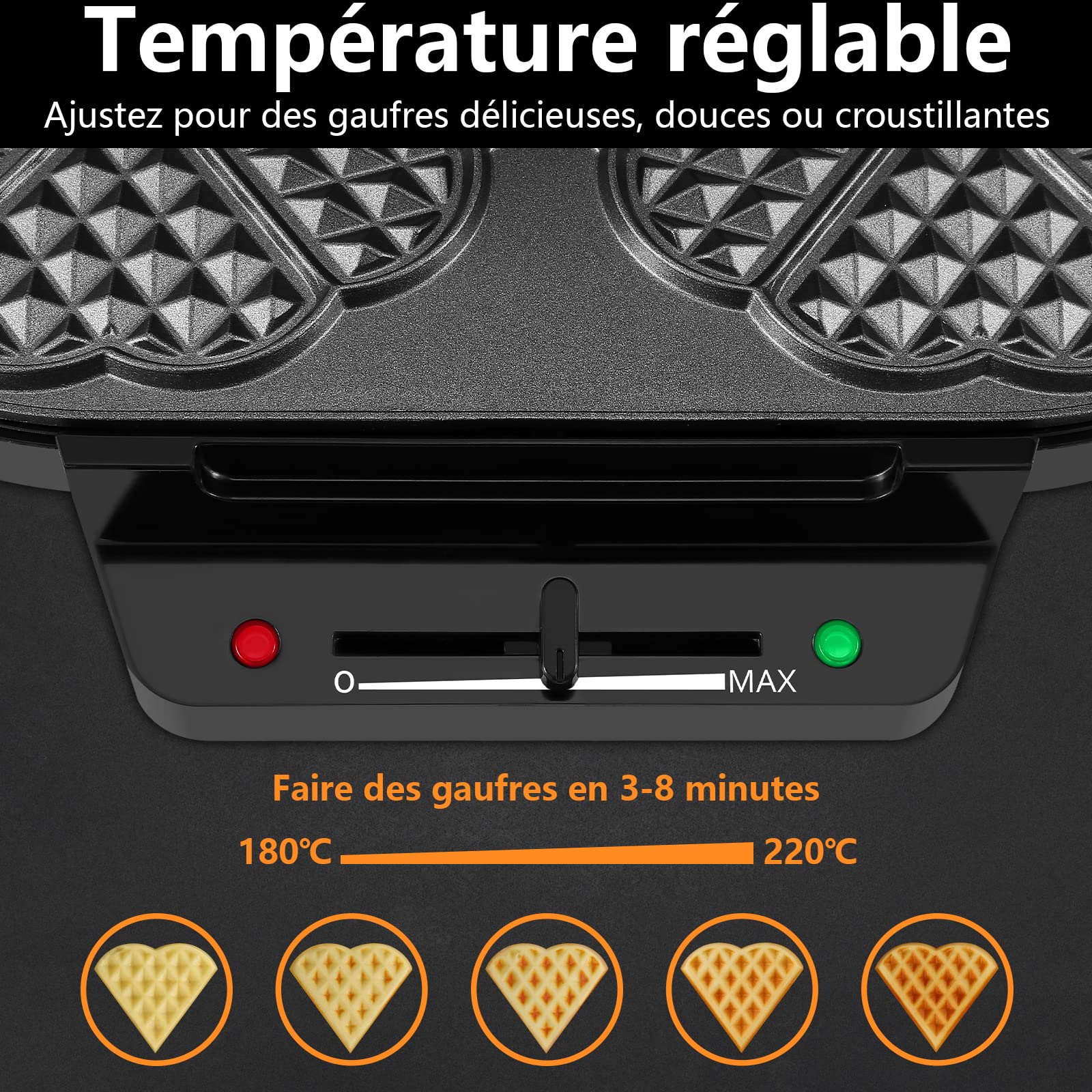 - Cinq niveaux de cuisson réglables : Ce mini gaufrier en forme de cœur offre 5 niveaux de cuisson réglables avec des températures allant de 180°C à 220°C. Vous pouvez personnaliser le processus de cuisson selon vos goûts, et le témoin lumineux vous permet de vérifier si la gaufre est encore en train de cuire ou déjà prête